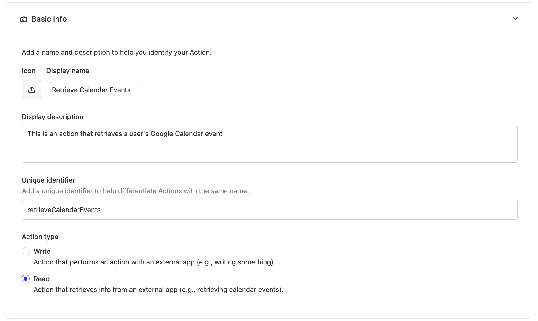 - Display Name: Choose a clear, descriptive name (e.g., "Calendar Events Retrieval")