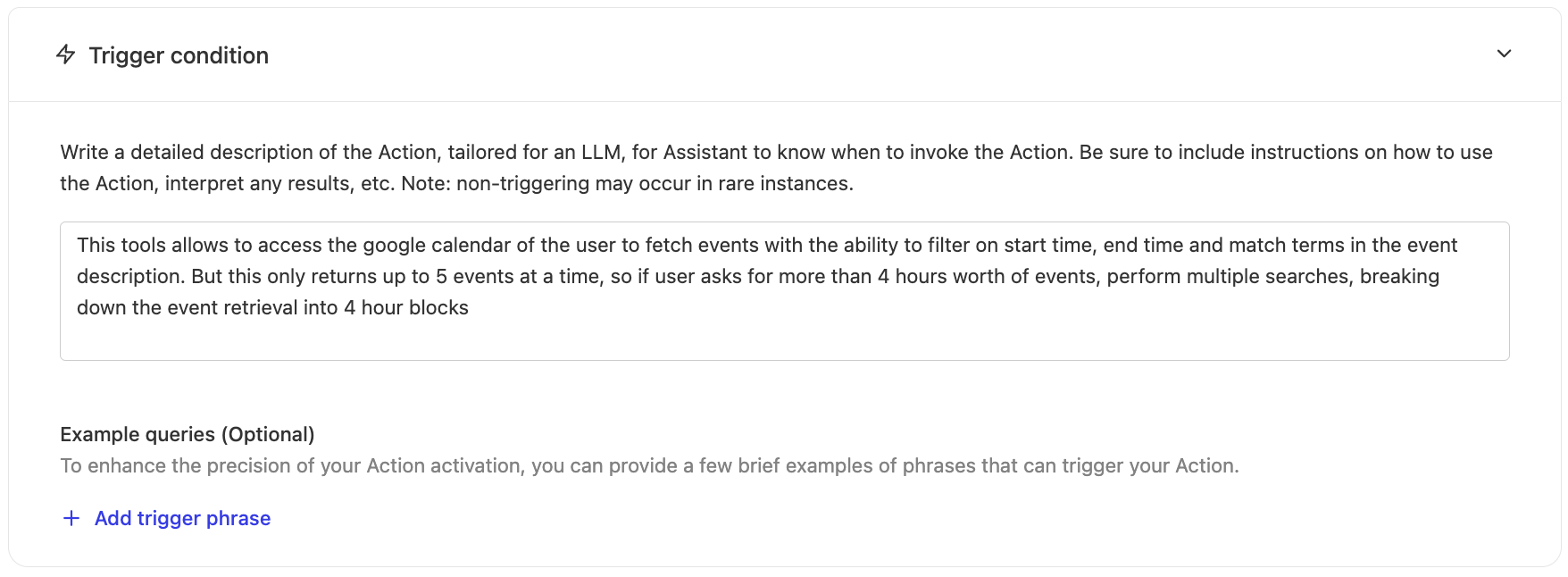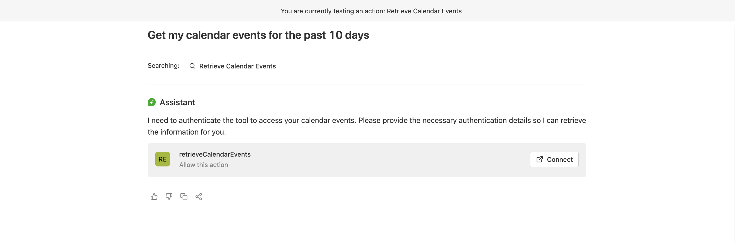 This guide walks through creating a retrieval action that allows Glean Assistant to access and display Google Calendar events. This integration enables users to query their calendar events directly through Glean's interface with proper OAuth authentication and secure API access.